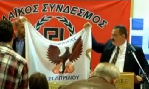 Και οι προκλήσεις δεν σταμάτησαν εκεί αφού κατά τη διάρκεια των εγκαινίων των γραφείων, ο προκλητικός υπαρχηγός του Νίκου Μιχαλολιάκου, Χρήστος Παππάς σήκωσε τη σημαία της χούντας και είπε «δεν έχουμε κανένα πρόβλημα να δείξουμε τα λάβαρα που έχουμε εδώ. Είναι η σημαία με τον αναδυόμενο Φοίνικα».