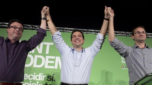 «Τα προβλήματα της Ελλάδας είναι και δικά μας προβλήματα. Θέλω να δώσω πολλά ευχαριστώ στον Αλέξη που έδωσε ελπίδα στην Ευρώπη. Αλέξη, έχεις το λόγο» είπε ο Joan Herrera, υποψήφιος του αριστερού κόμματος στις καταλανικές εκλογές, καλωσορίζοντας τον πρόεδρο του ΣΥΡΙΖΑ στο βήμα.