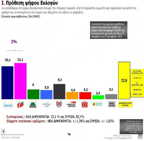 Στην πρόθεση ψήφου, σύμφωνα με τις εξαμηνιαίες τάσεις της MRB, ο ΣΥΡΙΖΑ προηγείται με ποσοστό 22,1%, ενώ η Νέα Δημοκρατία συγκεντρώνει ποσοστό 20,1%. Τρίτο κόμμα αναδεικνύεται η Χρυσή Αυγή με 9,3% και ακολουθούν: ΠΑΣΟΚ (6%), Ανεξάρτητοι Ελληνες (5,5%), Δημοκρατική Αριστερά (4,4%), ΚΚΕ (4,2%) και Οικολόγοι Πράσινοι (2,4%). Άλλο κόμμα απαντά το 3,1%, Λευκό το 1,1%, Άκυρο το 6,3%, ενώ αδιευκρίνιστη είναι η ψήφος για το 22,9% των ερωτηθέντων.