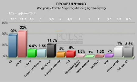 Προβάδισμα στον ΣΥΡΙΖΑ με 23% έναντι 20% της ΝΔ δίνει η νέα δημοσκόπηση της εταιρείας Pulse RC που δημοσιεύεται στην εφημερίδα “Το Ποντίκι”.