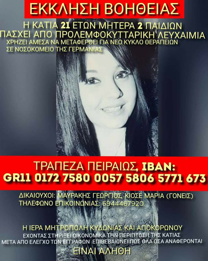 Την τελευταία προσπάθεια για να κερδίσει την μάχη με την λευχαιμία, διεκδικεί η 21χρονη Χανιώτισσα μητέρα 2 παιδιών, που προκειμένου να ταξιδέψει και πάλι στη Γερμανία για θεραπεία, αναγκάζεται να ζητήσει την προσφορά όλων μας για να το καταφέρει.