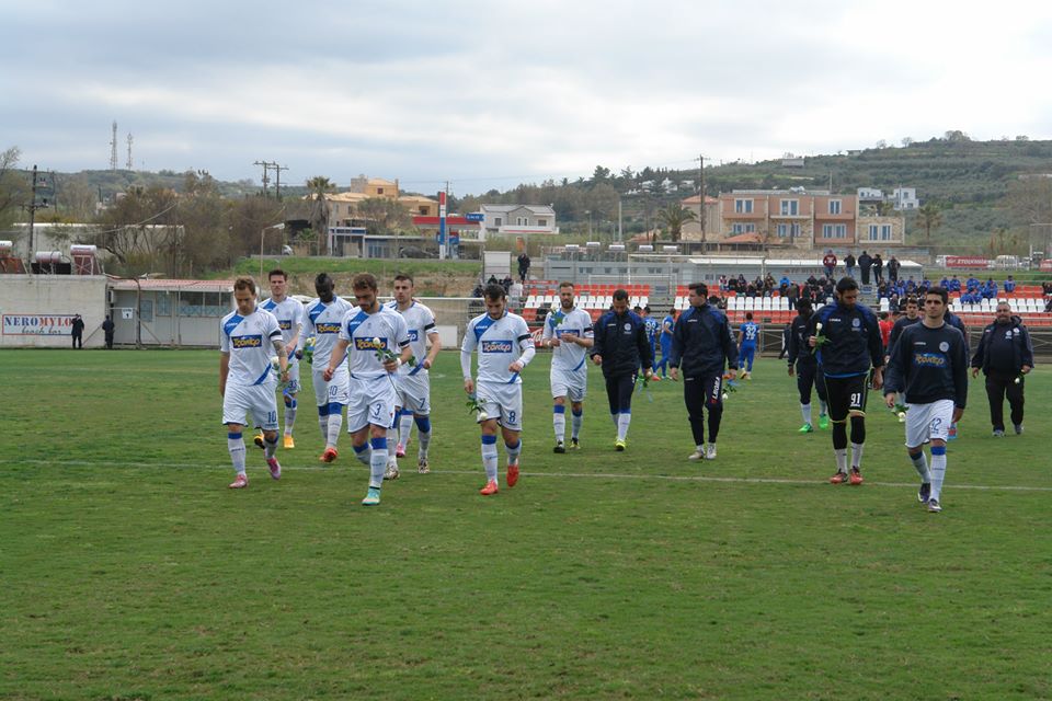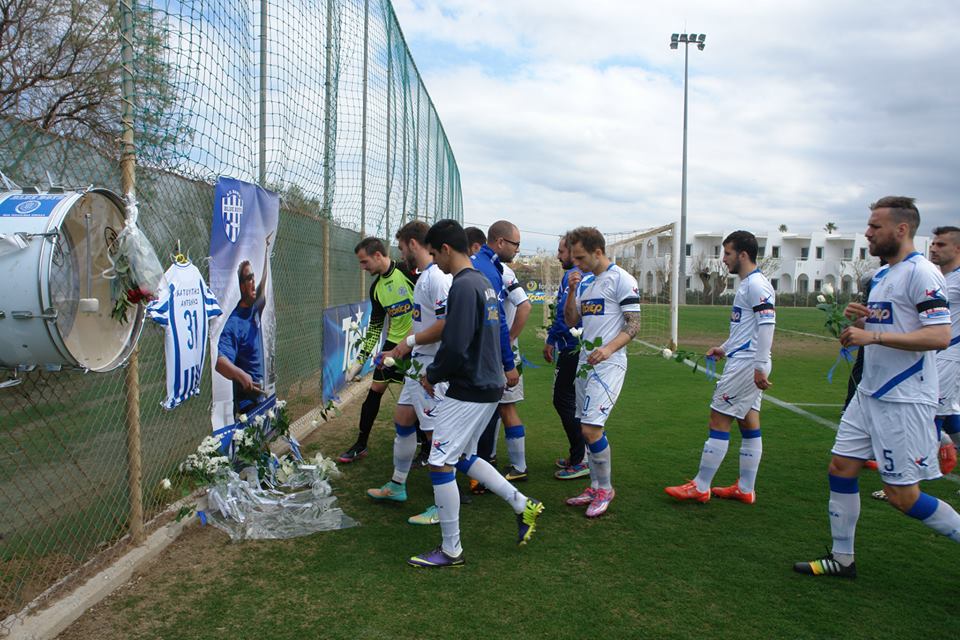 Νωρίτερα και μετά το καθιερωμένο εθιμοτυπικό με τους χαιρετισμούς των δυο ομάδων παίκτες και προπονητές τόσο του ΑΟ Χανιά όσο και της Επισκοπής άφησαν από ένα λουλούδι στον χώρο όπου βρισκόταν το τύμπανο, η φανέλα και το πανό.