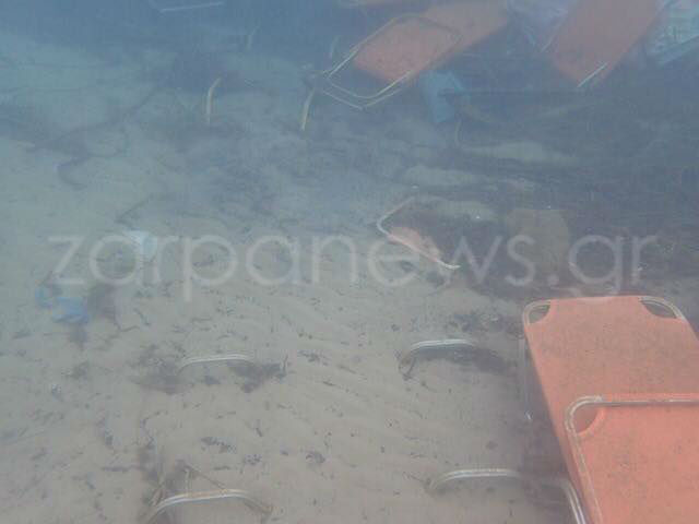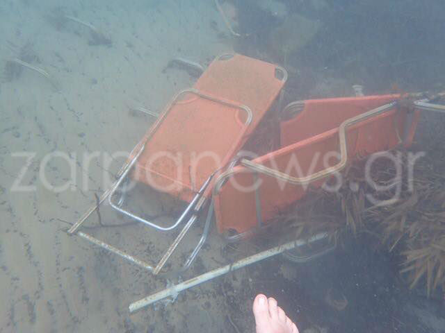 Τραπεζάκια, ξαπλώστρες ακόμα και μεγάλες ομπρέλες παραλίας βρίσκονται στον βυθό της θάλασσας, αποτέλεσμα της πρόσφατης κακοκαιρίας.