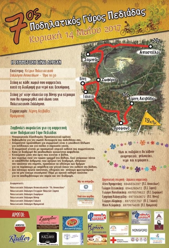 Με την στήριξη της Περιφέρειας Κρήτης θα πραγματοποιηθεί ο «7ος Ποδηλατικός Γύρος Πεδιάδας» που συνδιοργανώνεται από τους πολιτιστικούς συλλόγους Αποστόλων, Ενεργών Πολιτών Σαμπά, Ζωφόρων, Βόνης, Γαλατά Θραψανού, την αιγίδα του Δήμου Μινώα Πεδιάδας, την Κυριακή 14 Μαΐου 2017 στις 10:30 το πρωί με εκκίνηση στο κτίριο του Πολιτιστικού Συλλόγου του χωριού Αποστόλων Πεδιάδας.