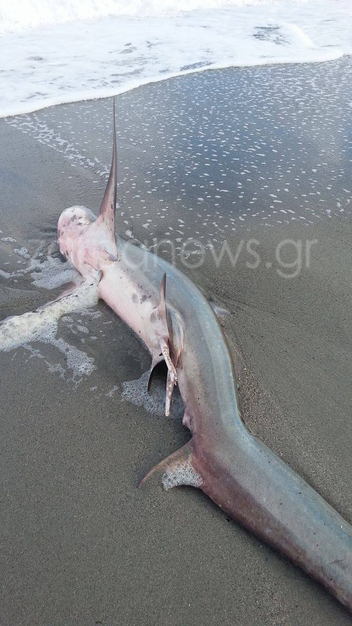 Δεν πίστευαν στα μάτια τους οι περίοικοι της παραλίας του Πλατανιά, όταν είδαν να ξεβράζεται από τη θάλασσα ένα καρχαριοειδές σχεδόν 3 μέτρα, όπως φαίνεται και στις φωτογραφίες του zarpanews.gr