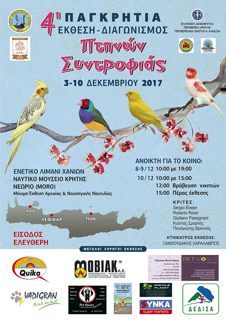 Η Λέσχη Ορνιθολογίας Χανίων διοργανώνει το 4ο Παγκρήτιο Πρωτάθλημα Πτηνών Συντροφιάς για το Χρονικό Διάστημα από 3-10 Δεκ 2017, στην Αίθουσα Μόνιμης Έκθεσης Αρχαίας & Παραδοσιακής Ναυπηγικής του Ναυτικού Μουσείου Χανίων (δίπλα στο Ναυτικό Όμιλο Χανίων).
