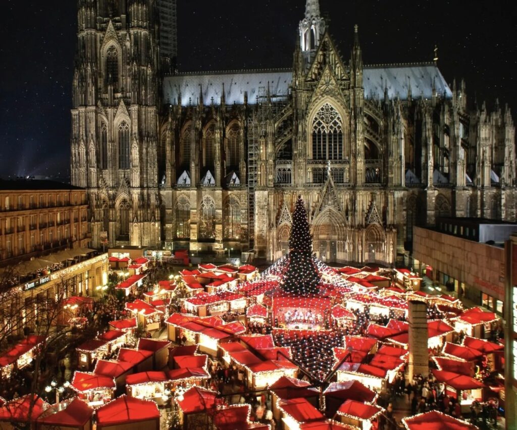 Η αγορά στον καθεδρικό ναό της Κολωνίας, γνωστή ως Weihnachtsmarkt am Kölner Dom, έχει τα πάντα: 150 ξύλινους πάγκους και σπιτάκια με χαρακτηριστικές, κόκκινες τέντες, περισσότερες από 100 μουσικές και θεατρικές παραστάσεις, ένα γιγάντιο χριστουγεννιάτικο δέντρο καλυμμένο με 50.000 λαμπιόνια, νοστιμότατες σπεσιαλιτέ, όπως οι καταπληκτικές τηγανίτες από πατάτα συνοδευόμενες από πουρέ μήλου, και το πιο επιβλητικό κτήριο της πόλης να ρίχνει ρομαντικά τη σκιά του πάνω της.