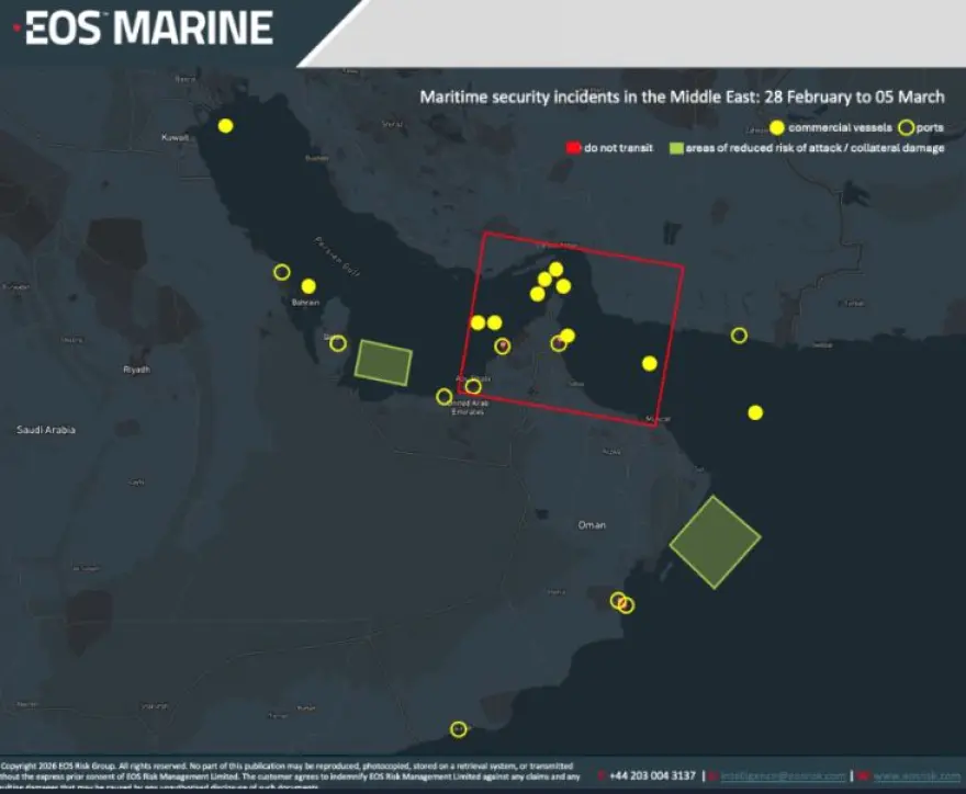 Σύμφωνα με την ενημέρωση ασφαλείας, ο κίνδυνος για εμπορικά πλοία στον Περσικό Κόλπο, τον Κόλπο του Ομάν και σε λιμένες και αγκυροβόλια των Ηνωμένων Αραβικών Εμιράτων, του Μπαχρέιν και του Κατάρ παραμένει υψηλός (4/5), με αυξημένη πιθανότητα νέων περιστατικών.