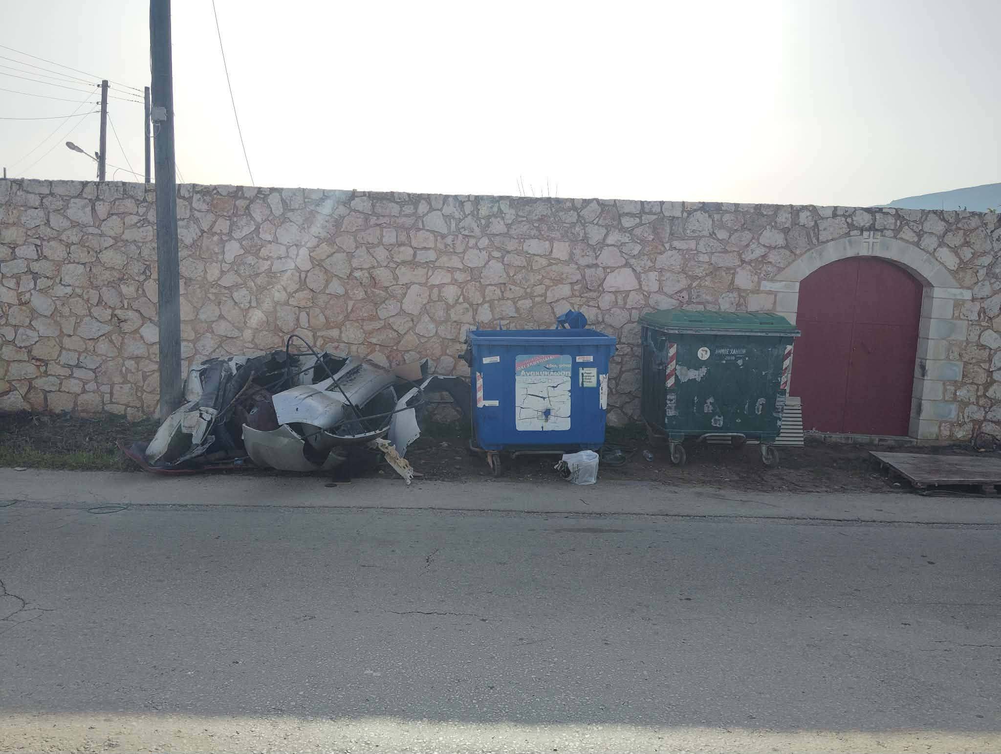 Πόρτες, προφυλακτήρες αυτοκινήτων από τρακαρισμένα αυτοκίνητα, μπάζα οικοδομών μέχρι και λεκάνες τουαλέτας μπορεί να βρει κανείς μια απλή καθημερινή μέρα στους δρόμους των Χανίων.
