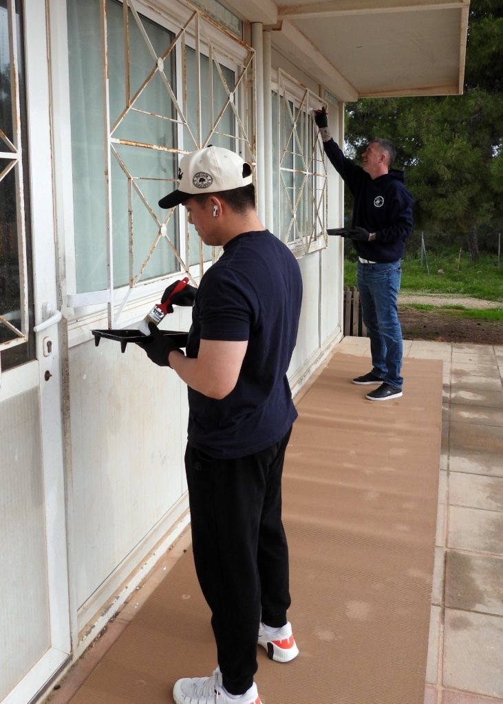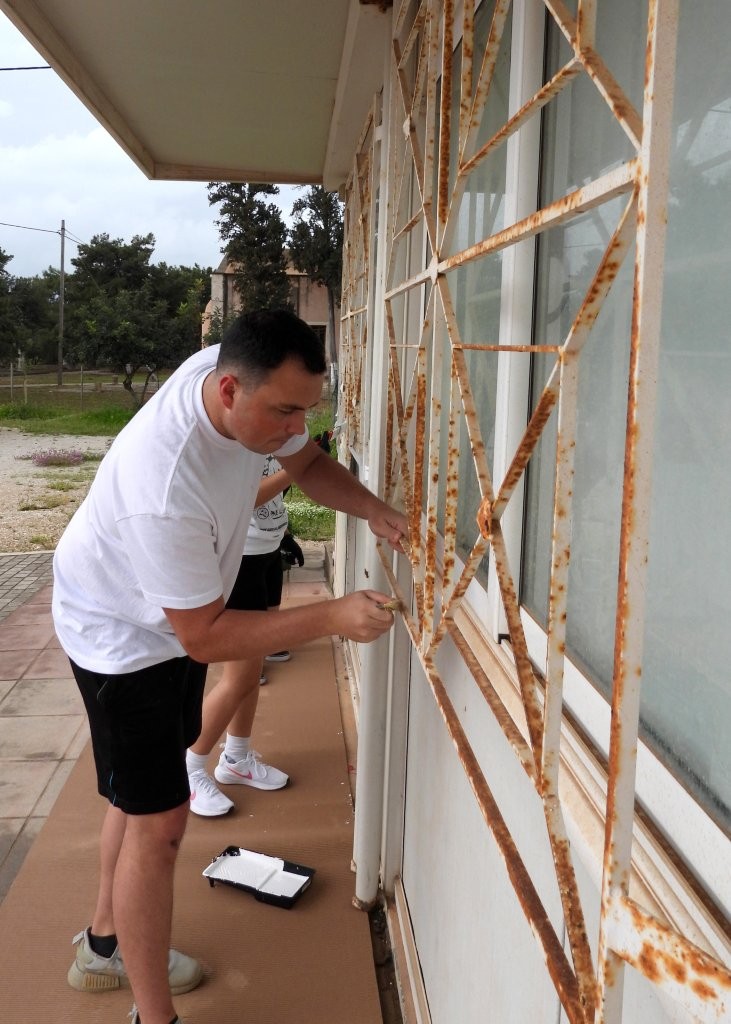 Εθελοντές από την Αμερικανική Ευκολία Αεροπορικής Βάσης Σούδας έβαψαν τα προστατευτικά κιγκλιδώματα των παραθύρων των αιθουσών του Δημοτικού Σχολείου Παζινού Ακρωτηρίου, στις 17 Απριλίου.