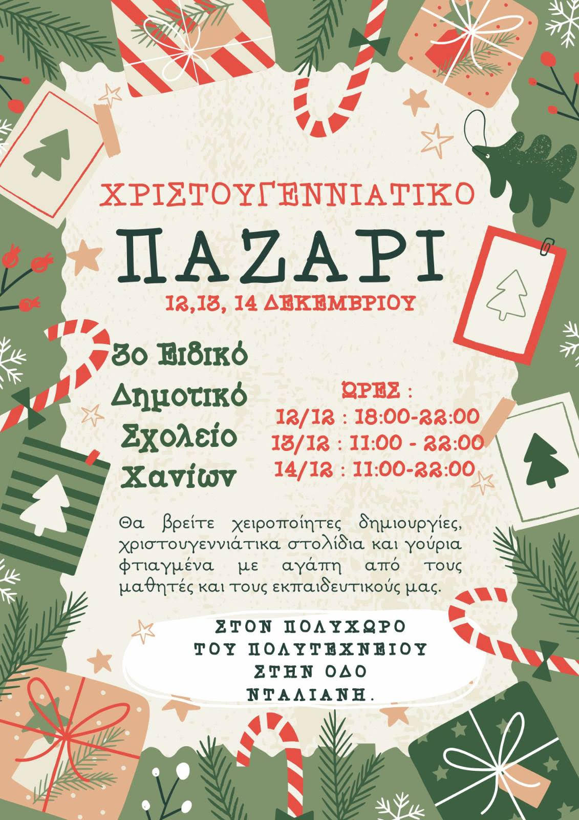 Το 3ο Ειδικό Δημοτικό Σχολείο Χανίων διοργανώνει Χριστουγεννιάτικο παζάρι την Παρασκευή 12, το Σάββατο 13 και την Κυριακή 14 Δεκεμβρίου στον Πολυχώρο του Πολυτεχνείου στην οδό Νταλιάνη.