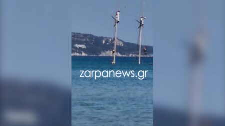 Όπως φαίνεται στο βίντεο του zarpanews.gr, νεαροί σκαρφαλώνουν στο κατάρτι ενός βυθισμένου ιστιοφόρου και βουτούν από εκεί στη θάλασσα.