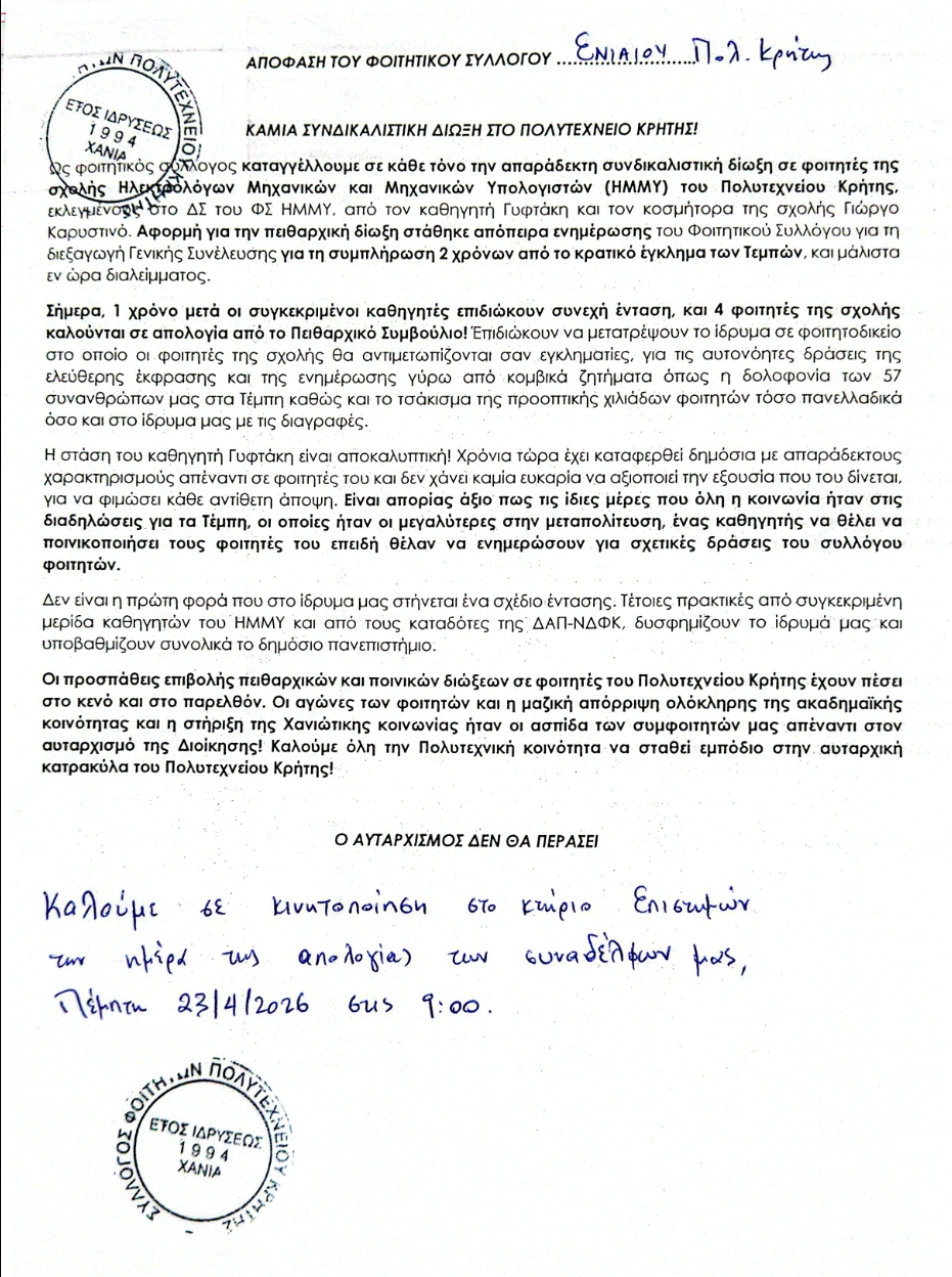 Ο Ενιαίος Φοιτητικός Σύλλογος Πολυτεχνείου Κρήτης, με ανακοίνωση του καταγγέλλει «συνδικαλιστική δίωξη σε φοιτητές της σχολής Ηλεκτρολόγων Μηχανικών και Μηχανικών Υπολογιστών (ΗΜΜΥ) του Πολυτεχνείου Κρήτης, από τον καθηγητή Γυφτάκη και τον κοσμήτορα της σχολής Γιώργο Καρυστινό».
