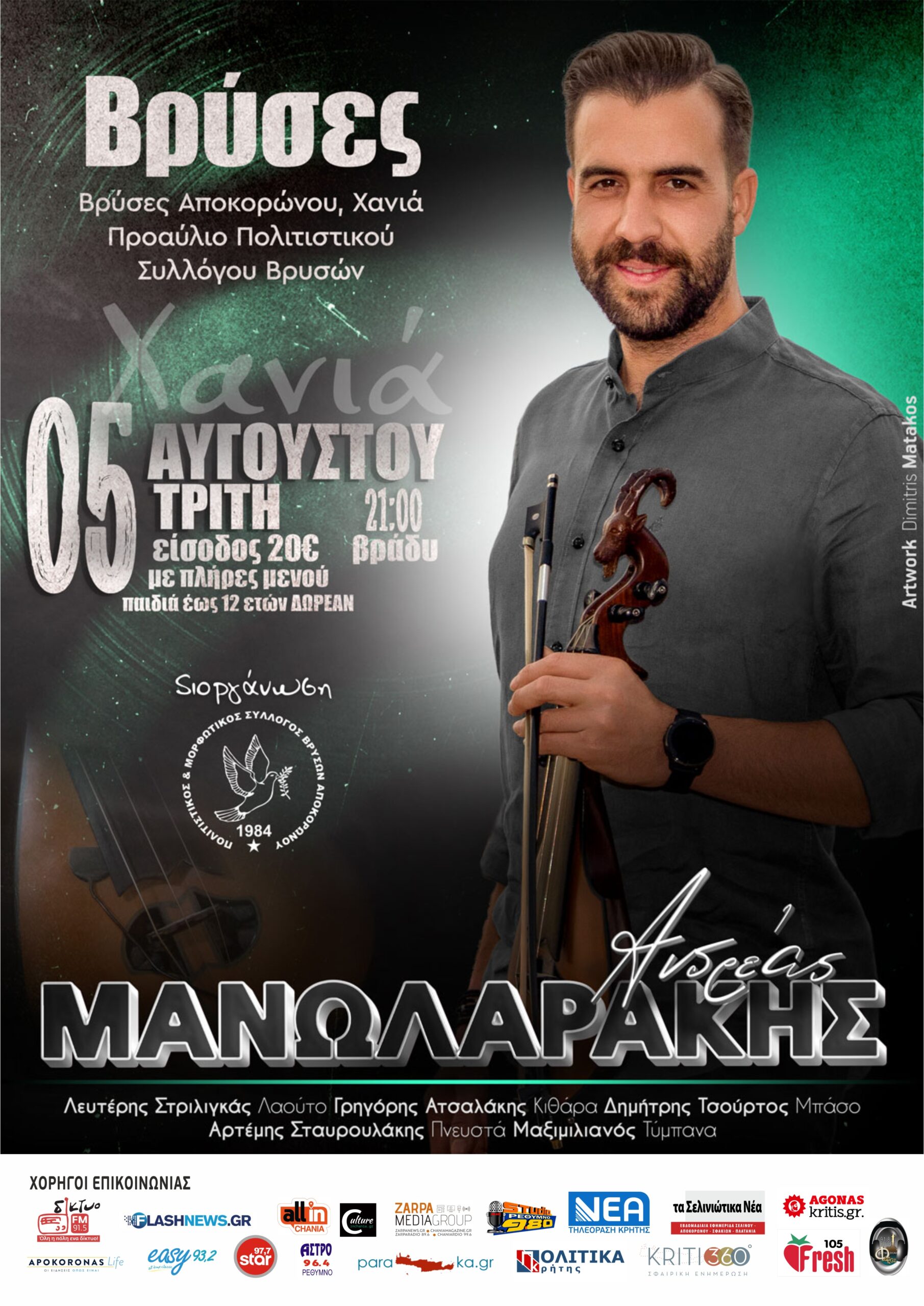 Τη βραδιά θα πλαισιώσει μουσικά ο αγαπημένος καλλιτέχνης Ανδρέας Μανωλαράκης με το συγκρότημά του, σε ένα πρόγραμμα γεμάτο με παραδοσιακές μελωδίες και γνήσιο Κρητικό κέφι.