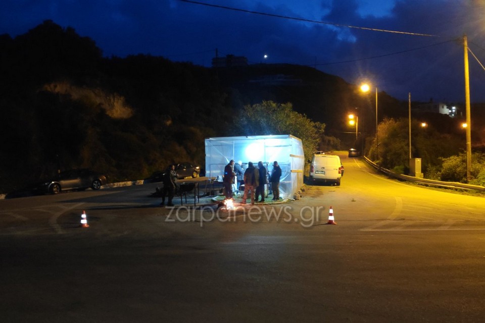 Μπλόκο στην εθνική οδό, στα Μεγάλα Χωράφια έστησαν οι αγρότες και κτηνοτρόφοι των Χανίων, όπου και διανυκτέρευσαν το βράδυ.