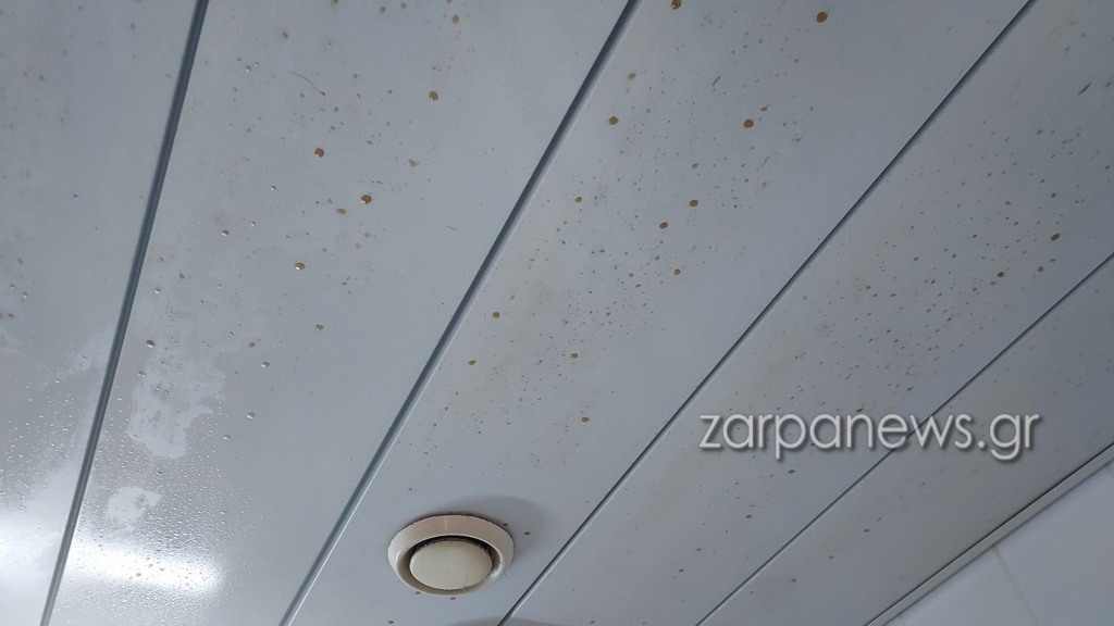 Στις φωτογραφίες αναγνώστη του zarpanews.gr φαίνεται το ταβάνι από το μπάνιο ενός δωματίου της Α’παθολογικής κλινικής, από το οποίο στάζει ένα καφέ υγρό. Κατά πάσα πιθανότητα πρόκειται για σκουριά που υγροποιήθηκε με υδρατμούς. Θα μπορούσε βέβαια να είναι και βρωμιά ή χώμα. “Το θέαμα πάντως είναι αποκρουστικό. Η μυρωδιά της ουρίας στην τουαλέτα είναι ανυπόφορη μιας και ο χώρος του μπάνιου δεν διαθέτει παράθυρο”, δηλώνει χαρακτηριστικά ο αναγνώστης του zarpanews.gr