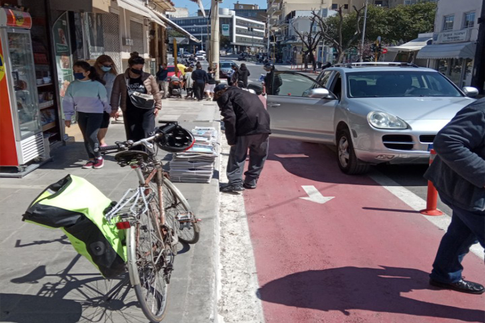 Σε άλλη περίπτωση, κλείνουμε τον δρόμο με το αυτοκίνητό μας και τον ποδηλατόδρομο με την πόρτα του αυτοκινήτου μας. Βέβαια και ο πεζός που κοιτάζει τις εφημερίδες, δεν έχει καμιά δουλειά εκεί, θα έπρεπε να ήταν στο πεζοδρόμιο.