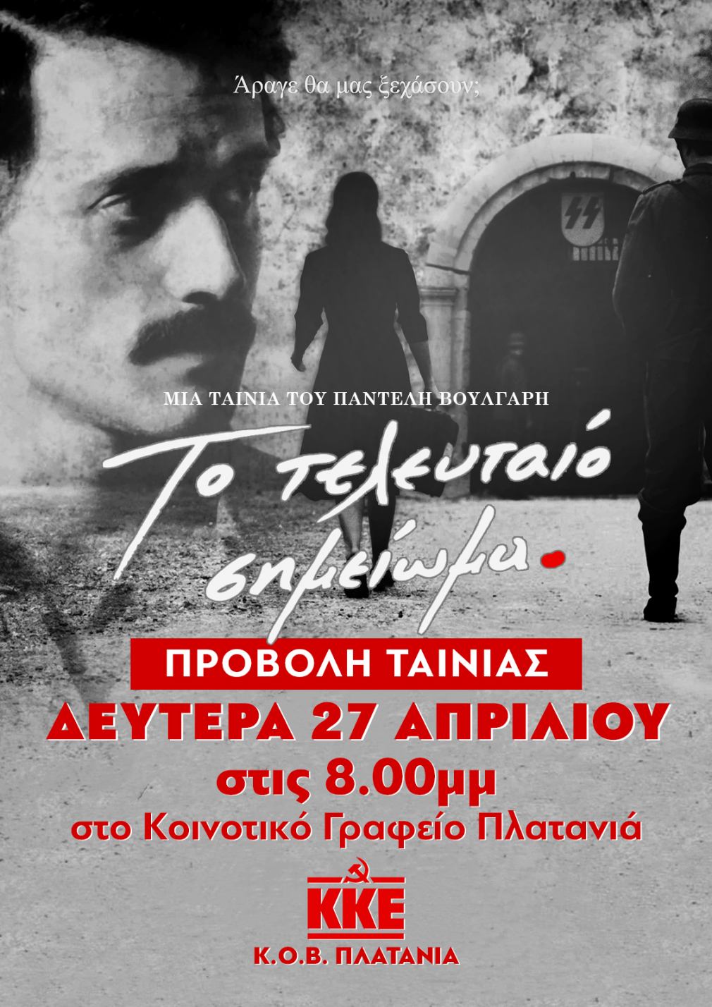 Χανιά | Προβολές της ταινίας του Παντελή Βούλγαρη «Το Τελευταίο Σημείωμα» από το ΚΚΕ με αφορμή την Πρωτομαγιά