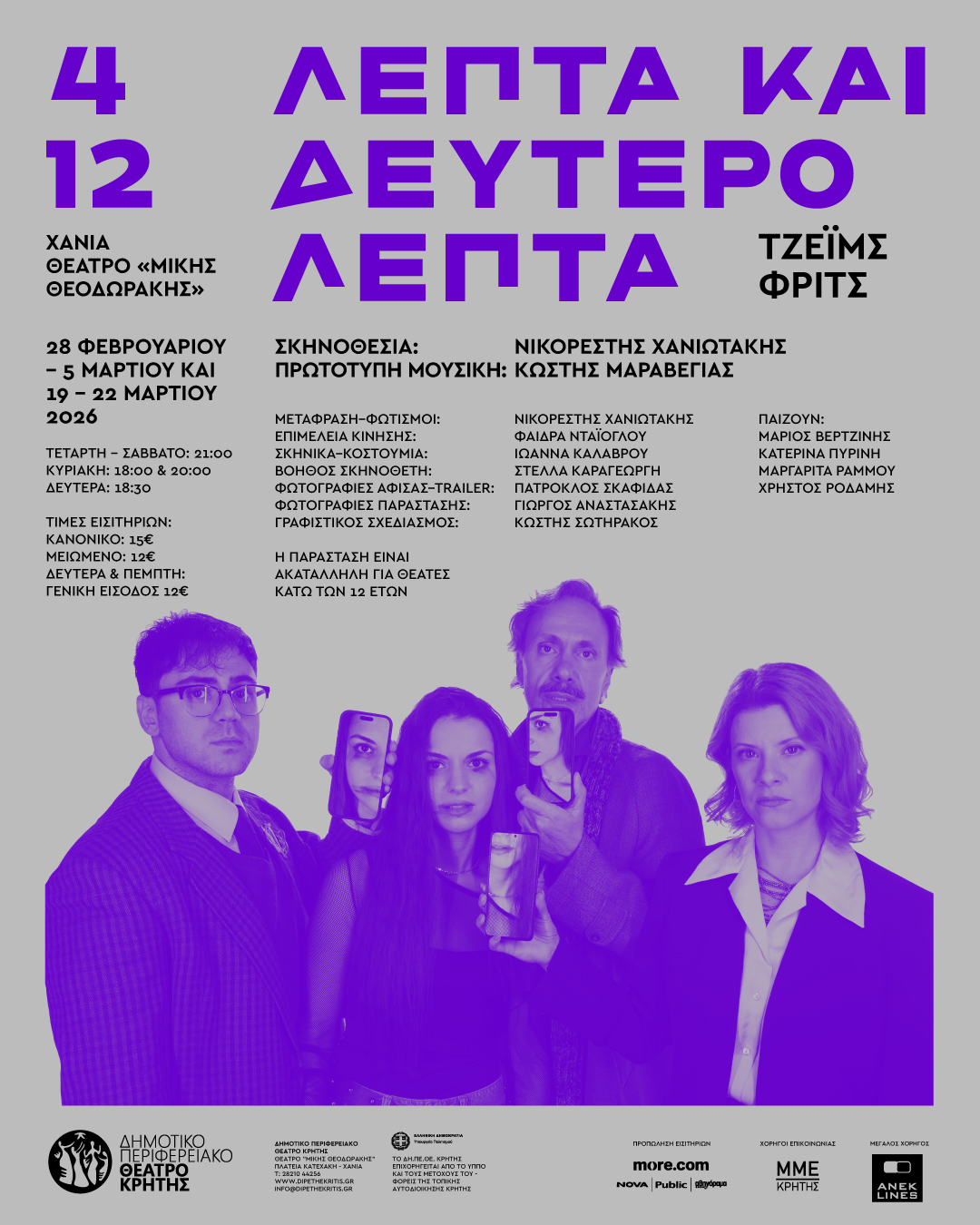 Ηλεκτρονική προπώληση: https://www.more.com/gr-el/tickets/theater/4-lepta-kai-12-deuterolepta-1/ και στο ταμείο του θεάτρου μιάμιση ώρα πριν από την παράσταση.