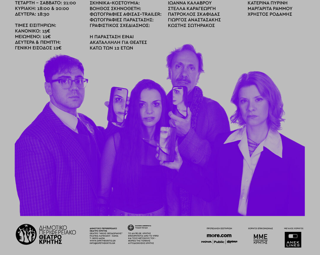 Ηράκλειο, αίθουσα «Μανόλης Καρέλλης»: Σάββατο 7 Μαρτίου στις 21:00 και Κυριακή 8 Μαρτίου στις 18:30