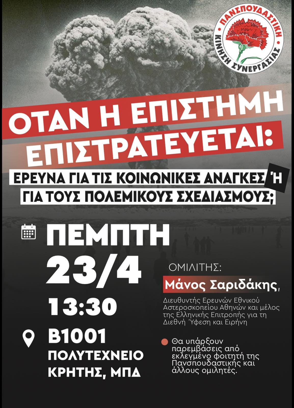 Η Πανσπουδαστική Κίνηση Συνεργασίας πραγματοποιεί εκδήλωση την Πέμπτη 23 Απρίλη στις 13:30 στο Πολυτεχνείο Κρήτης , στο αμφιθέατρο Β1001, στο ΜΠΔ με τίτλο «Όταν η επιστήμη επιστρατεύεται: Έρευνα για τις κοινωνικές ανάγκες ή για τους πολεμικούς σχεδιασμούς;». Θα μιλήσει ο Μάνος Σαριδάκης , Διευθυντής Ερευνών του Εθνικού Αστεροσκοπείου Αθηνών και μέλος της Ελληνικής Επιτροπής για τη Διεθνή Ύφεση και Ειρήνη. Θα πραγματοποιηθεί παρέμβαση από τον Φραγκίσκο Κελεση εκλεγμένο με την Πανσπουδαστική Κ.Σ. στον Φοιτητικό Σύλλογο της Αρχιτεκτονικής.
