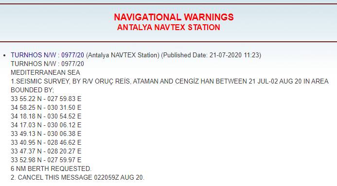 Παράλληλα με την Navtex για σεισμικές έρευνες στην Ανατολική Μεσόγειο, είναι από τη Δευτέρα σε ισχύ και Navtex που εξέδωσε ο σταθμός της Σμύρνης, με την οποία δεσμεύεται μία μεγάλη περιοχή στην καρδιά του Αιγαίου για άσκηση με πραγματικά πυρά.