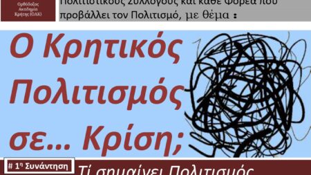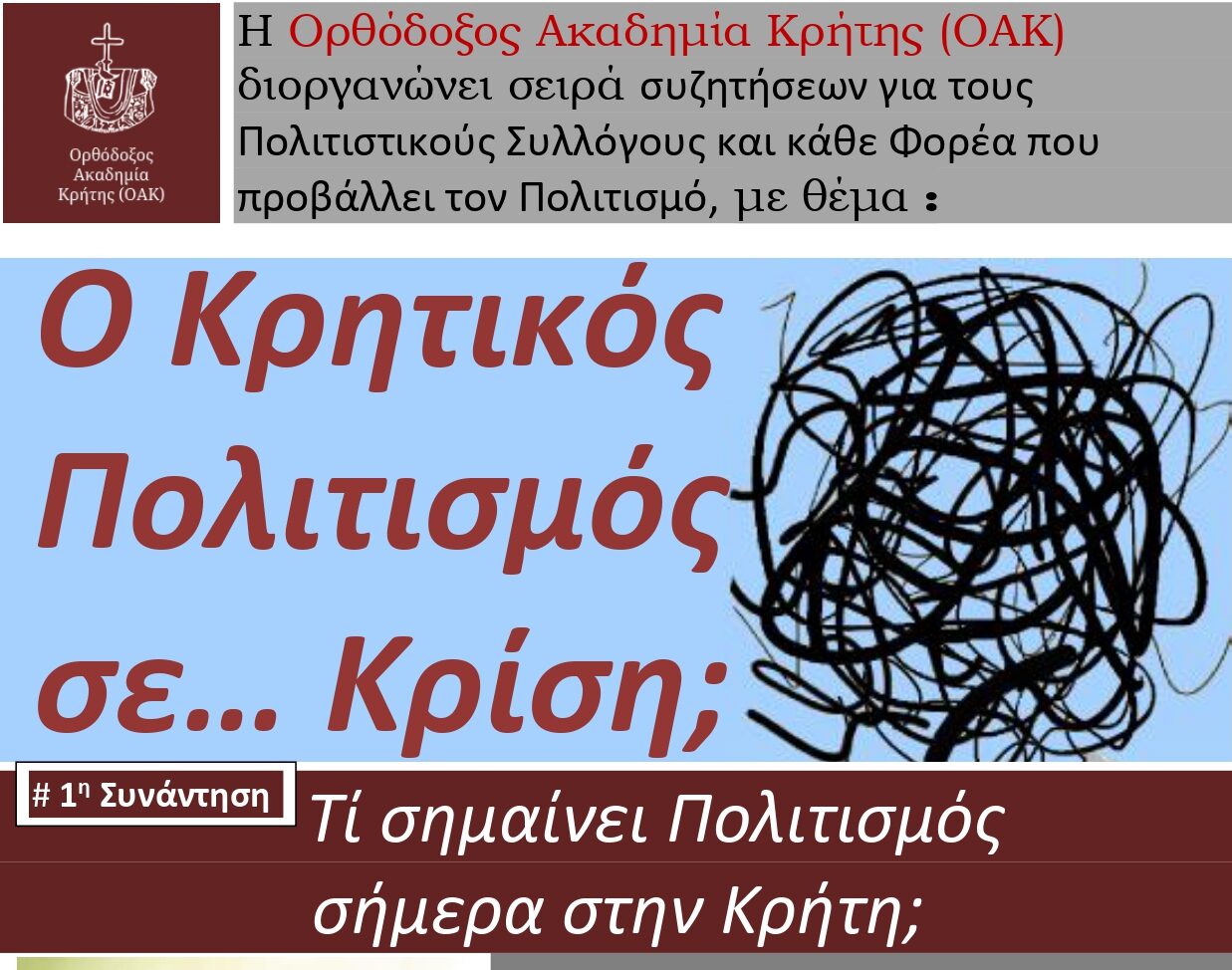 H Ορθόδοξος Ακαδημία Κρήτης (ΟΑΚ) διοργανώνει μία σειρά συζητήσεων, με κεντρικό θέμα: «Ο Κρητικός Πολιτισμός σε… Κρίση;». Παράλληλα, κάνει ανοικτό κάλεσμα προς όλους τους Πολιτιστικούς Συλλόγους και σε κάθε Φορέα που προβάλλει τον Πολιτισμό του τόπου μας, όπως και σε κάθε ιδιώτη που ενδιαφέρεται να συμβάλει στο διάλογο αυτό, τόσο αναγκαίο για το μέλλον της κρητικής παράδοσης.