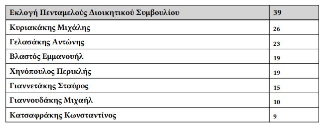 – Για το Δ.Σ. εξελέγησαν οι κ.κ. Κυριακάκης Μιχάλης, Γελασάκης Αντώνης, Βλαστός Εμμανουήλ, Χηνόπουλος Περικλής και Γιαννετάκης Σταύρος