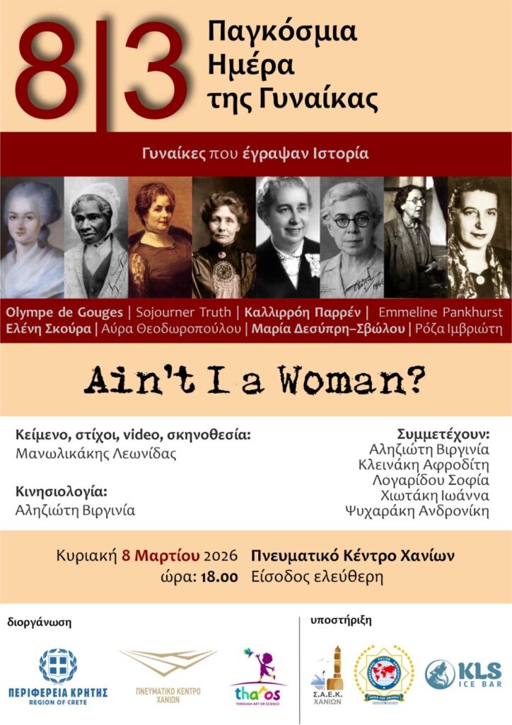 Πρόκειται για το θεατρικό δρώμενο με τίτλο «8 Γυναίκες που Έγραψαν Ιστορία: Ain’t I a Woman?», το οποίο θα παρουσιαστεί με αφορμή την Παγκόσμια Ημέρα της Γυναίκας, την Κυριακή 8 Μαρτίου 2026 και ώρα 18:00, στο Πνευματικό Κέντρο Χανίων. Επίσης την Θεατρική Παράσταση με τίτλο «Πες τα, ρε μάνα», την Κυριακή 8 Μαρτίου 2026, ώρα 20:00, στο Θέατρο «Δημήτρης Βλησίδης». Αναλυτικότερα: