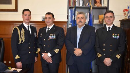 O Αντιπεριφερειάρχης Χανίων Νίκος Καλογερής υποδέχτηκε, το Μεγάλο Σάββατο 11 Απριλίου 2026 το πρωί, τον Τακτικό Διοικητή της Ναυτικής Επιχείρησης «Mediterraneo Sicuro» Υποναύαρχο Massimo Bonu, ο οποίος συνοδευόταν από τον Κυβερνήτη της ιταλικής φρεγάτας «Federico Martinengo» Πλοίαρχο Marco Cassetta, και τον Ανθυποπλοίαρχο Maurizio Dell’Aquila.