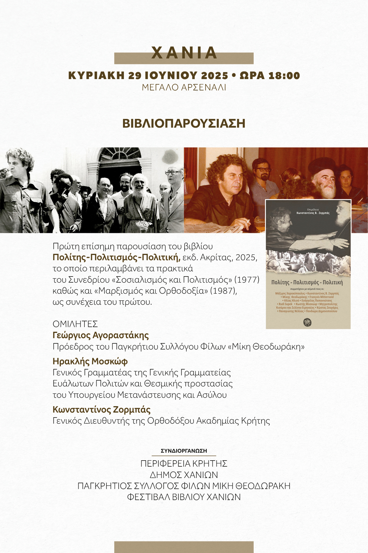 Την Κυριακή 29 Ιουνίου και ώρα 18:00 στο Μεγάλο Αρσενάλι θα πραγματοποιηθεί στο πλαίσιο των εκδηλώσεων της «Τριλογίας Ιδεών», η οποία είναι αφιερωμένη στη μνήμη και στο έργο του οικουμενικού Μίκη Θεοδωράκη θα παρουσιαστεί στο 4ο Φεστιβάλ Βιβλίου Χανίων, η έκδοση του νέου βιβλίου, με τίτλο «Πολίτης – Πολιτισμός – Πολιτική», εκδ. Ακρίτας (2025), το οποίο περιλαμβάνει τα πρακτικά του Συνεδρίου «Σοσιαλισμός και Πολιτισμός (1977) καθώς και «Μαρξισμός και Ορθοδοξία» (1987) στην Ορθόδοξο Ακαδημία Κρήτης.