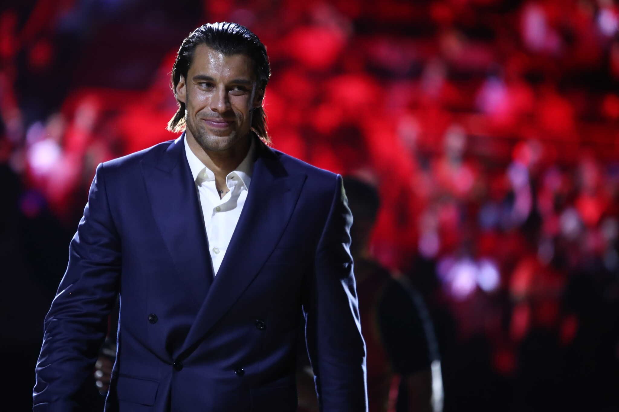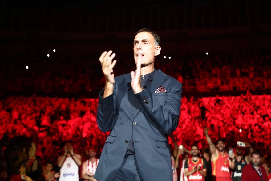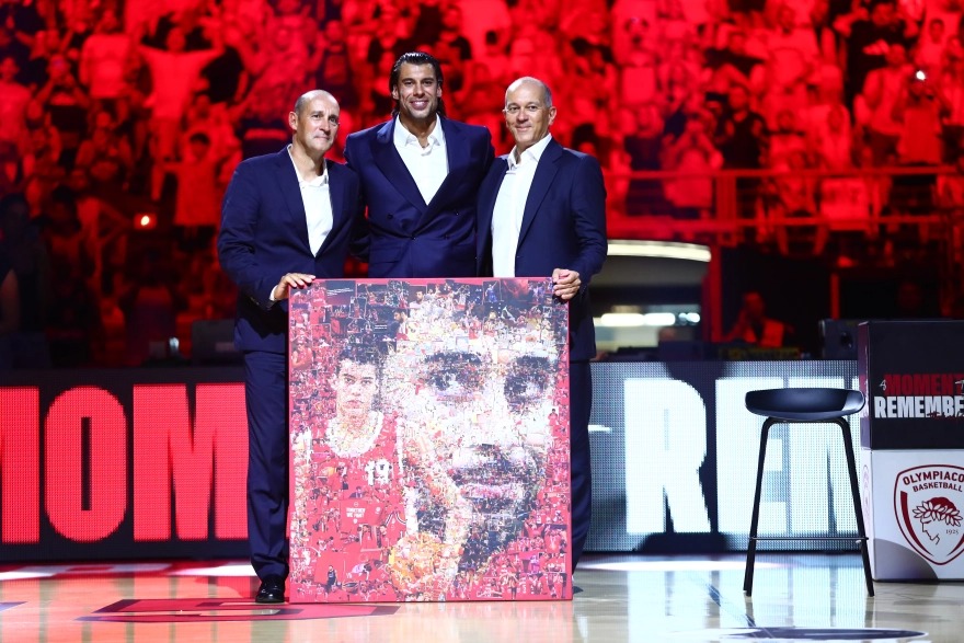 Ο άνθρωπος που πήγε στα 15 του στον Ολυμπιακό και έφυγε δις πρωταθλητής Ευρώπης δήλωσε ότι «νιώθω ο πιο ακριβοπληρωμένος παίκτης όλων των εποχών χάρη στην αγάπη σας» και κάλεσε τις γυναίκες της ζωής του στο παρκέ για να πατήσουν όλοι μαζί το κουμπί για να ανέβει η φανέλα.