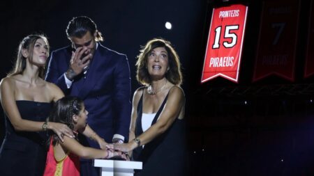 Δάκρυσε ο Πρίντεζης στην απόσυρση της φανέλας του από τον Ολυμπιακό – Στην οροφή του ΣΕΦ το Νο15 | Video + Photos