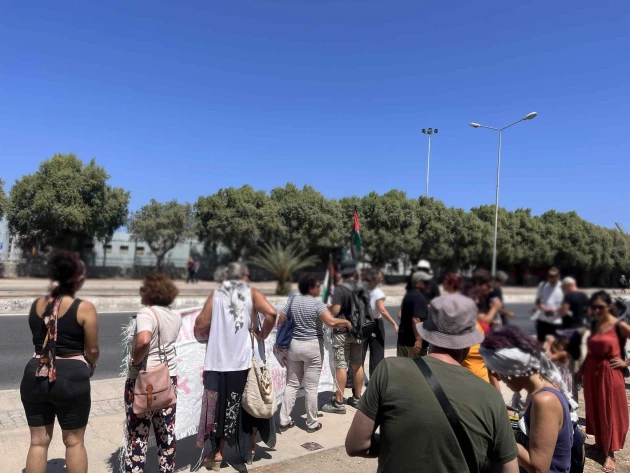 Από νωρίς το μεσημέρι, οι διαδηλωτές συγκεντρώθηκαν στην είσοδο εκτός του λιμανιού, κρατώντας πανό και φωνάζοντας συνθήματα καταγγελίας για τις επιχειρήσεις στη Γάζα. Όπως επισημαίνουν οι διοργανωτές, μέσα από τη δράση αυτή επιδιώκουν να σταλεί ένα «ηχηρό μήνυμα καταδίκης της γενοκτονίας» και να εκφραστεί η αλληλεγγύη στον παλαιστινιακό λαό.
