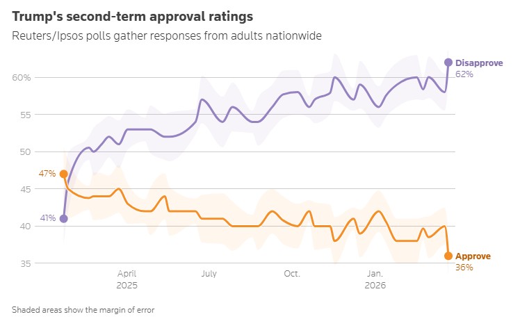 Η τετραήμερη δημοσκόπηση, η οποία ολοκληρώθηκε τη Δευτέρα, έδειξε ότι το 36% των Αμερικανών εγκρίνει την γενική απόδοση του Τραμπ, από 40% σε δημοσκόπηση των Reuters/Ipsos που διεξήχθη την περασμένη εβδομάδα.