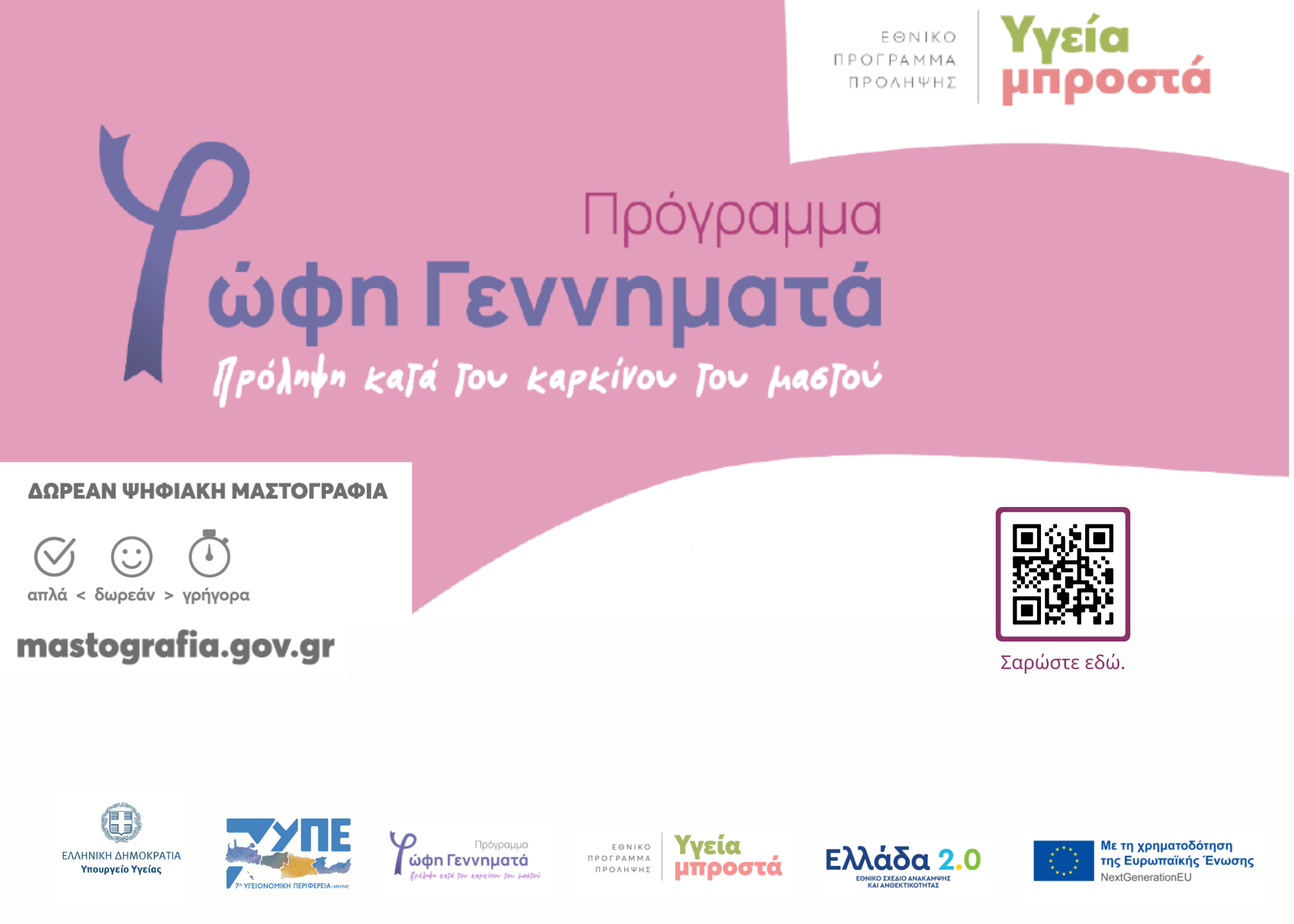 Στο πλαίσιο της Εθνικής Στρατηγικής Δημόσιας Υγείας και ειδικότερα του Εθνικού Σχεδίου Δράσης για τη Δημόσια Υγεία σχεδιάστηκε και υλοποιείται το Πρόγραμμα προληπτικών διαγνωστικών εξετάσεων για τον καρκίνο του μαστού «Φώφη Γεννηματά», με στόχο την έγκαιρη διάγνωση του εν λόγω καρκίνου.