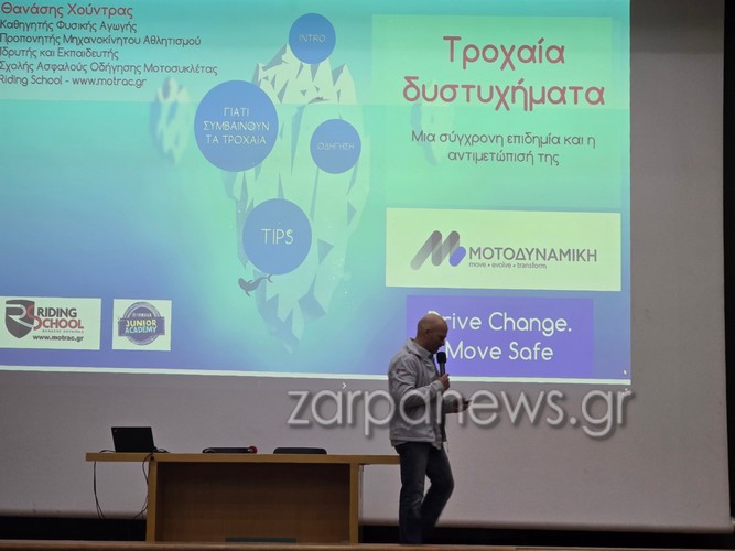 Ένα διαφορετικό μάθημα ασφαλούς οδήγησης είχαν την ευκαιρία να παρακολουθήσουν το [πρωί της Πέμπτης, μαθητές των λυκείων της Κοραή, στο πνευματικό κέντρο Χανίων, με ομιλητή τον Θανάση Χούντρα, ειδικό σε θέματα σωστής και ασφαλούς οδηγικής συμπεριφοράς, εκπαιδευτή οδηγών και Προπονητή Μηχανοκίνητου Αθλητισμού.