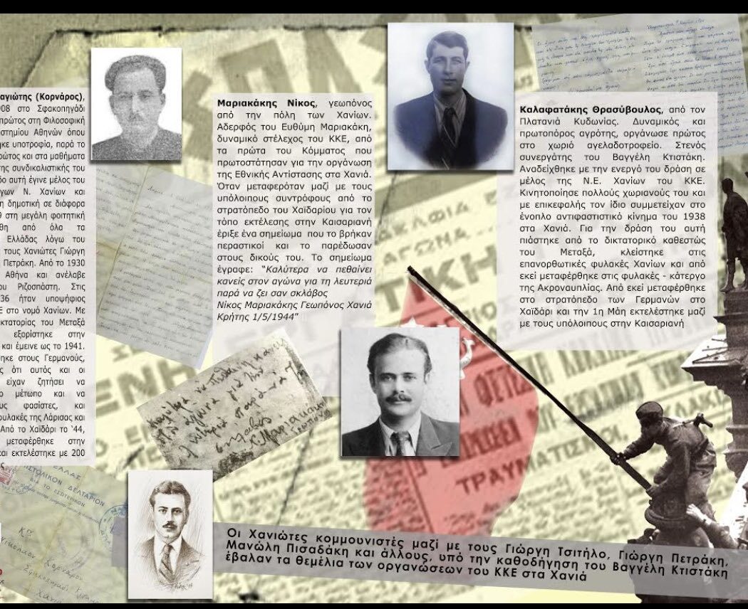Θυμούμενος επίσης την εκδήλωση τιμής από την Τομεακή Επιτροπή Χανίων του ΚΚΕ, μέσω της τοποθέτησης αναμνηστικής πλάκας στο σημείο όπου βρισκόταν το πατρικό σπίτι του παππού μου στον Πλατανιά Χανίων, δωρίζω τη φωτογραφία του παππού στο ιστορικό αρχείο του ΚΚΕ ως φόρο τιμής και μνήμης του.