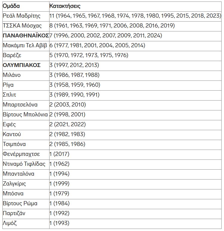 Στη δεύτερη θέση των πολυνικών συναντάμε την ΤΣΣΚΑ Μόσχας, που έχει κατακτήσει 8 φορές το τρόπαιο, ενώ ο Παναθηναϊκός , με 7 τίτλους, αποτελεί όχι μόνο την πιο επιτυχημένη ελληνική ομάδα, αλλά και έναν από τους πιο ισχυρούς ευρωπαϊκούς συλλόγους του σύγχρονου μπάσκετ. Ακολουθεί η Μακάμπι Τελ Αβίβ με 6 τίτλους, έχοντας γράψει τη δική της «χρυσή» σελίδα στο ευρωπαϊκό μπάσκετ.