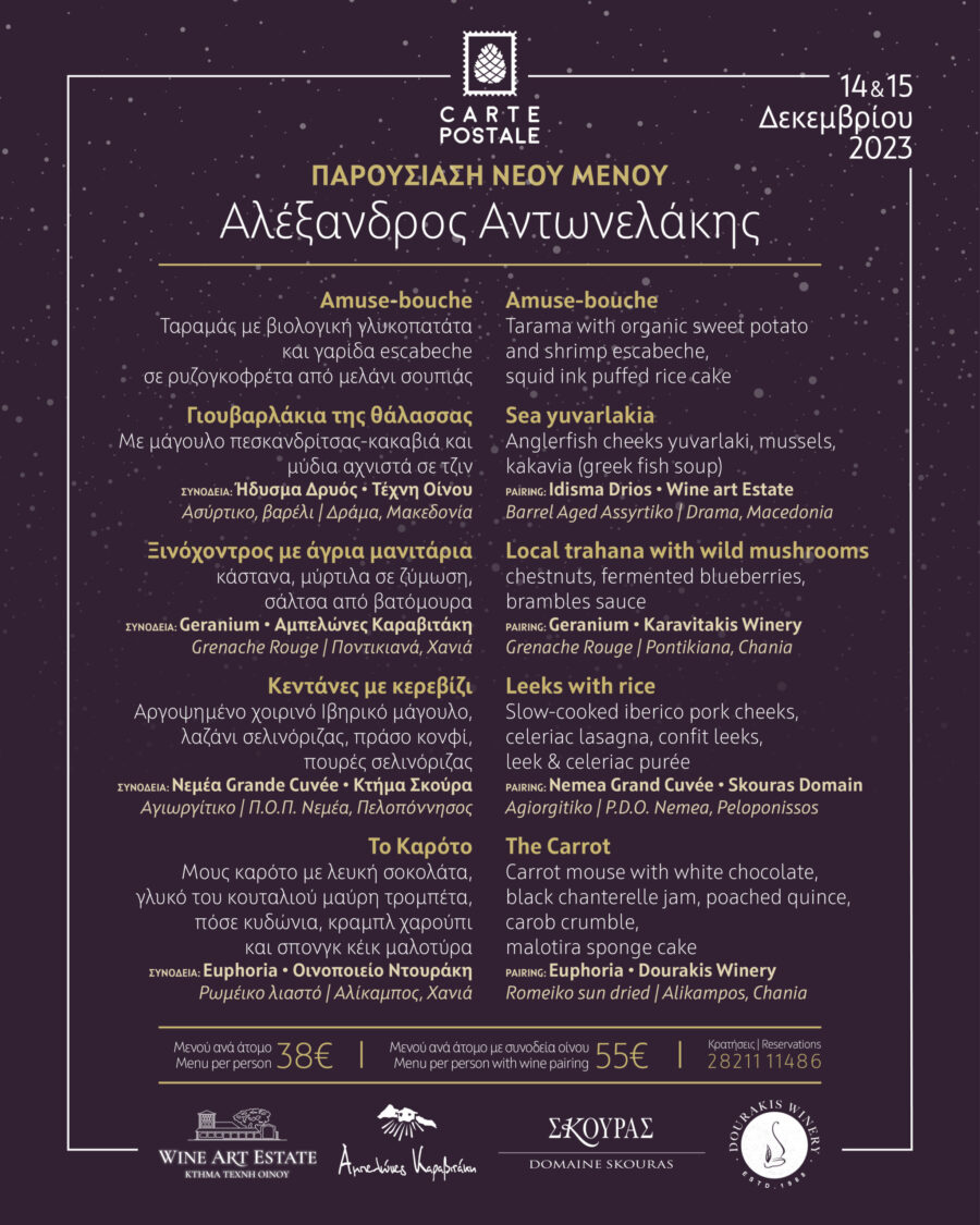 Τηλ κρατήσεων: 2821111486 – Μενού ανά άτομο: 38 ευρώ – με συνοδεία οίνου 55 ευρώ