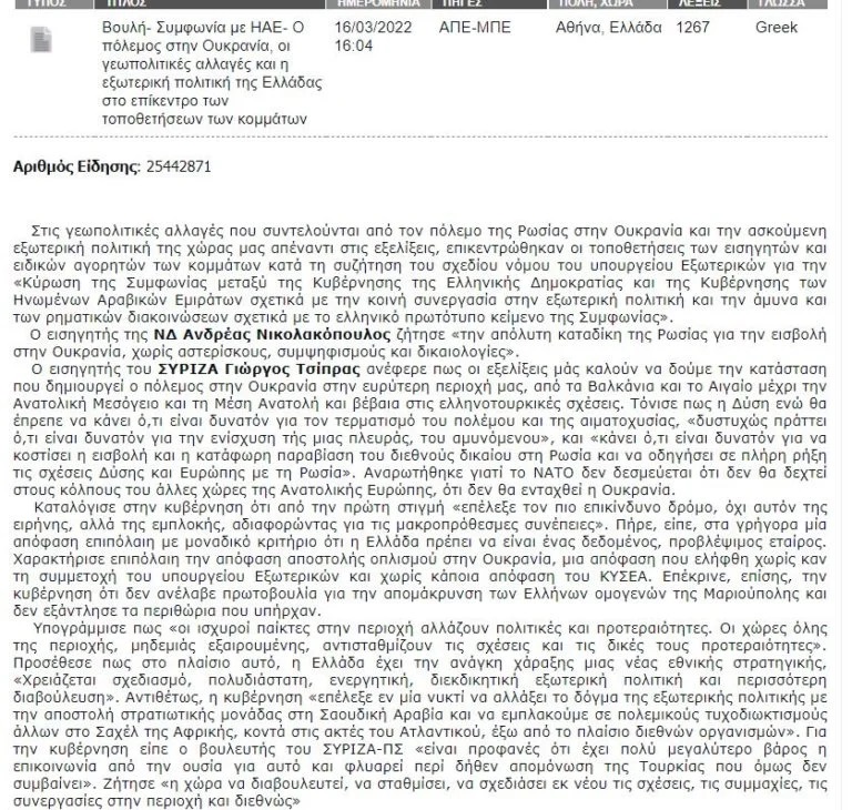 Δείτε το σχετικό απόσπασμα από το τηλεγράφημα του ΑΠΕ, στις 16 Μαρτίου 2022: