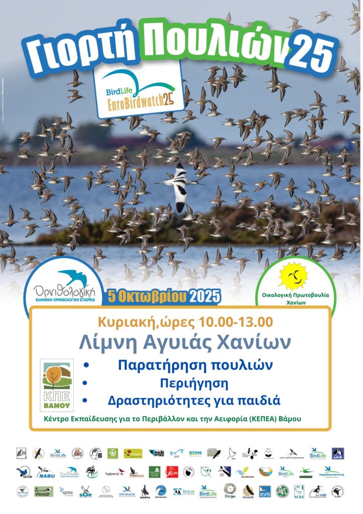 Γιορτή των Πουλιών την Κυριακή 5 Οκτώβρη στη λίμνη Αγυιάς Χανίων, από τις 10 το πρωί ως 1 το μεσημέρι οργανώνει η Οικολογική Πρωτοβουλία Χανίων η οποία συμμετέχει στη μεγαλύτερη εκδήλωση παρατήρησης πουλιών της Ευρώπης.