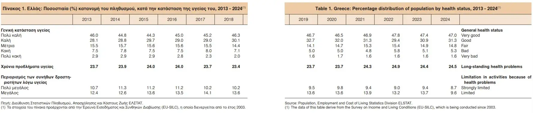 Παρόλα αυτά, το 24,5% του πληθυσμού παραδέχεται ότι αντιμετωπίζει κάποιο χρόνιο πρόβλημα υγείας, ποσοστό που παραμένει σταθερά υψηλό την τελευταία δεκαετία.