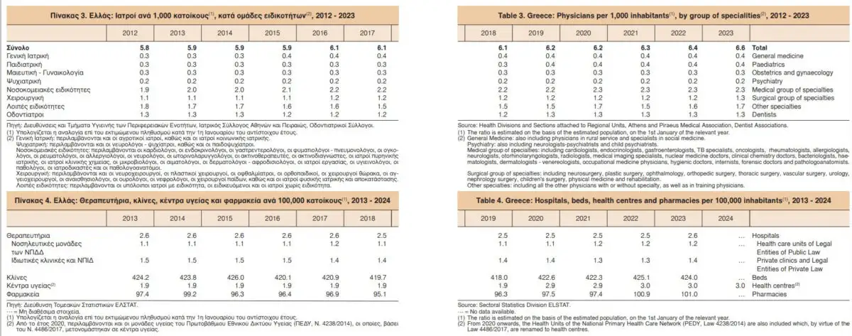 Στον αντίποδα, ο αριθμός των ιατρών φαίνεται υψηλός (6,5 ανά 1.000 κατοίκους), ωστόσο η κατανομή τους είναι άνιση, με τη συντριπτική πλειονότητα να ανήκει σε νοσοκομειακές ή χειρουργικές ειδικότητες και πολύ λιγότερους στη γενική ιατρική.