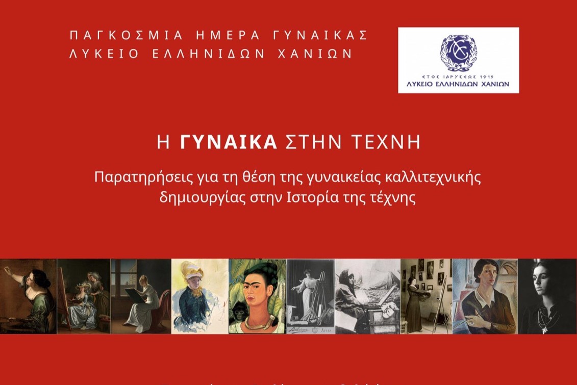 Εκδήλωση αφιερωμένη στην Ημέρα της Γυναίκας, διοργανώνει το Λύκειο Ελληνίδων Χανίων την Κυριακή 8 Μαρτίου στις 17:30, στην Αίθουσα Λυκείου Ελληνίδων Χανίων Κ. Μητσοτάκη 1: Η ΓΥΝΑΙΚΑ ΣΤΗΝ ΤΕΧΝΗ. Παρατηρήσεις για τη θέση της γυναικείας καλλιτεχνικής δημιουργίας στην Ιστορία της τέχνης.