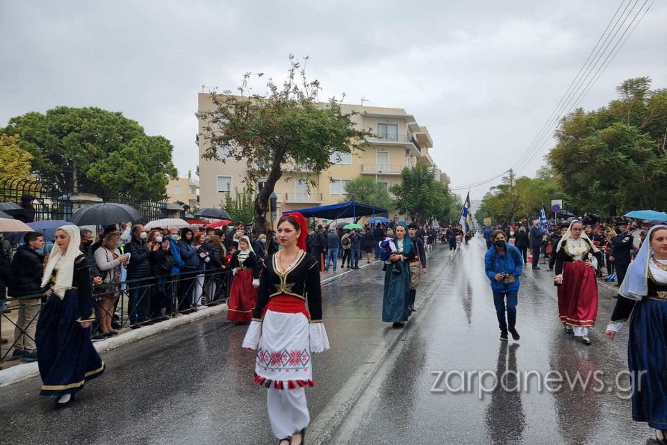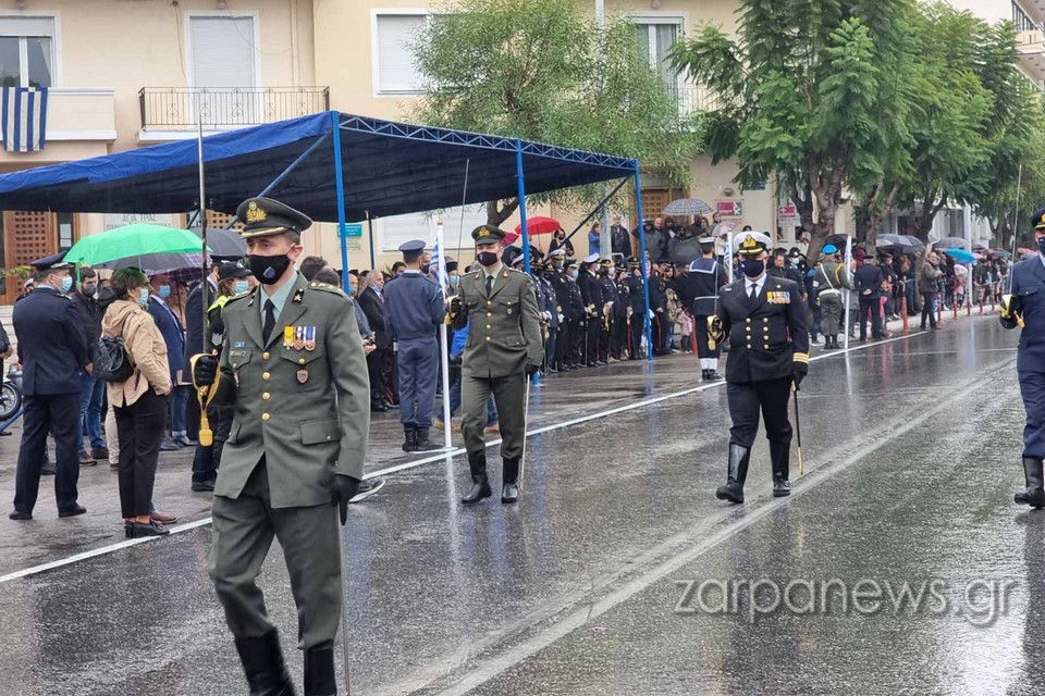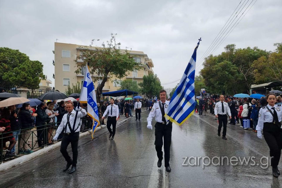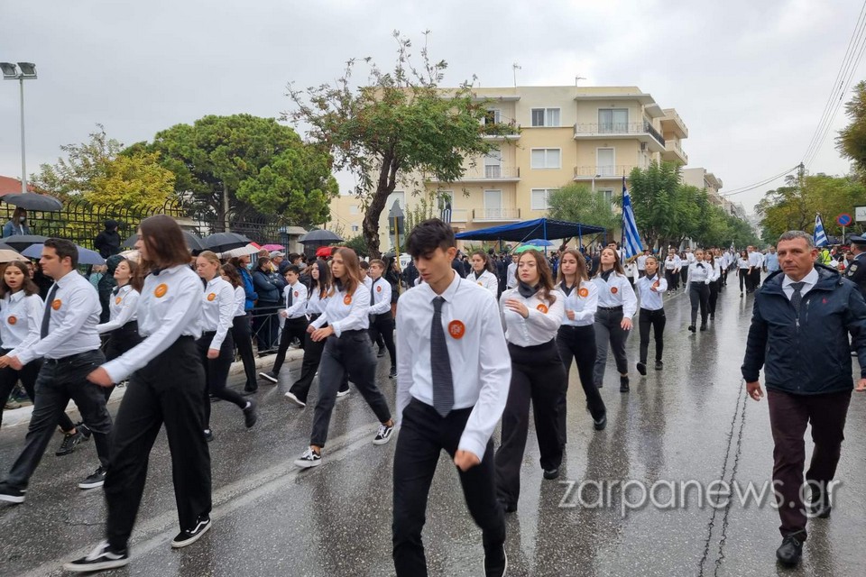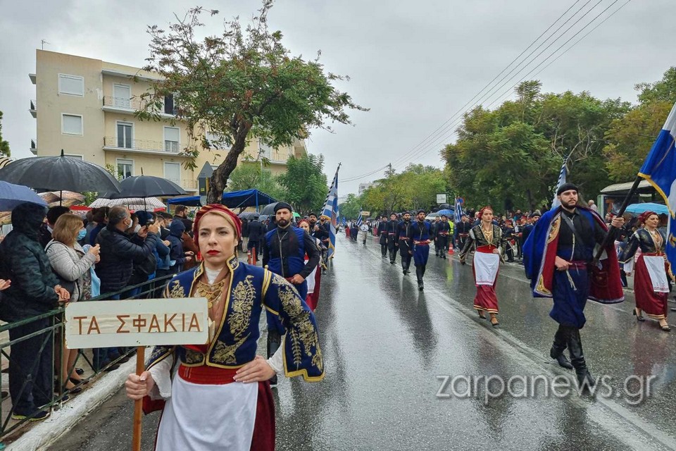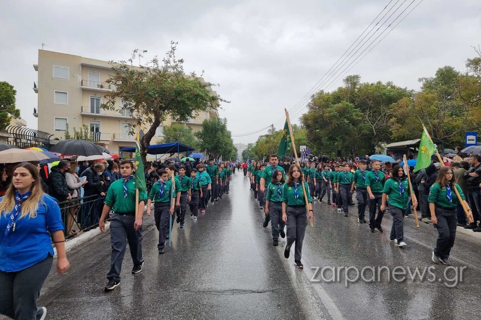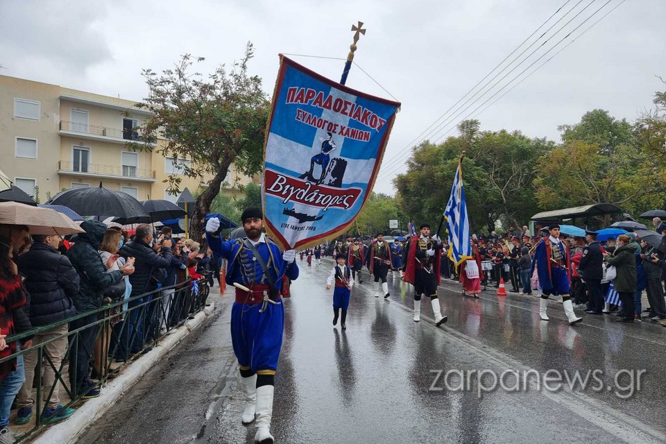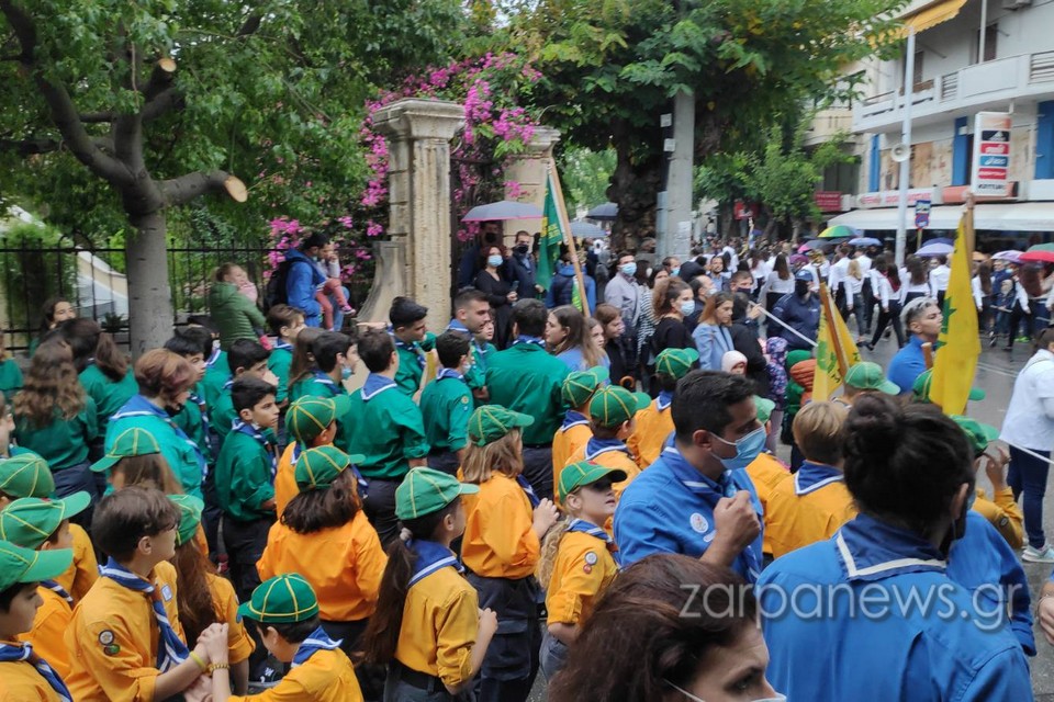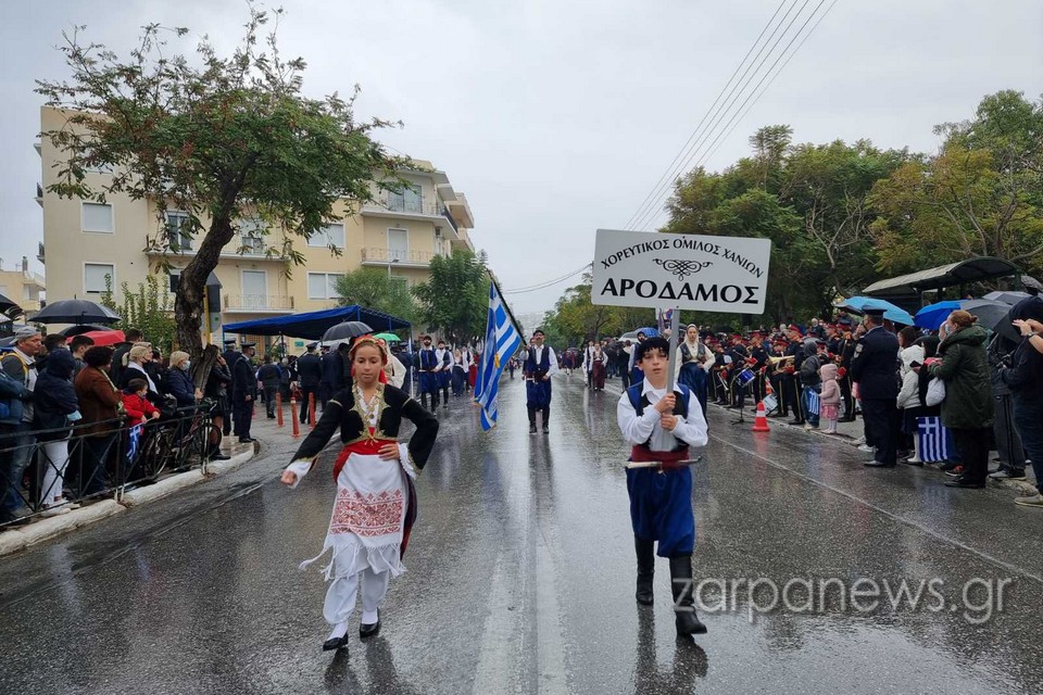 Στα πεζοδρόμια της οδού Παπανδρέου δεν έπεφτε καρφίτσα, με τους Χανιώτες να αγνοούν τον βροχερό καιρό και πλήθος οικογενειών με τα παιδιά και με ελληνικές σημαίες να παρακολουθούν και να χειροκροτούν τους παρελαύνοντες.