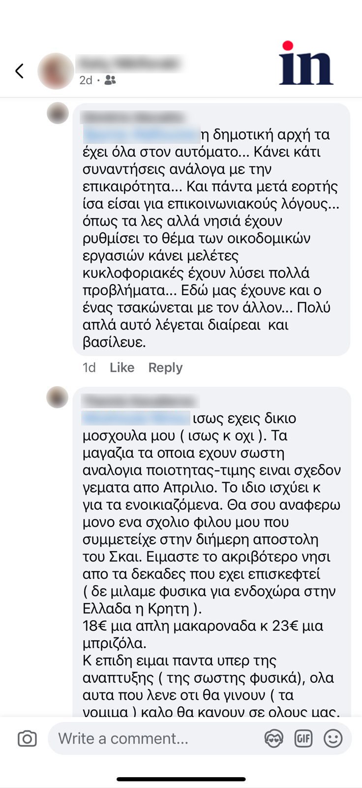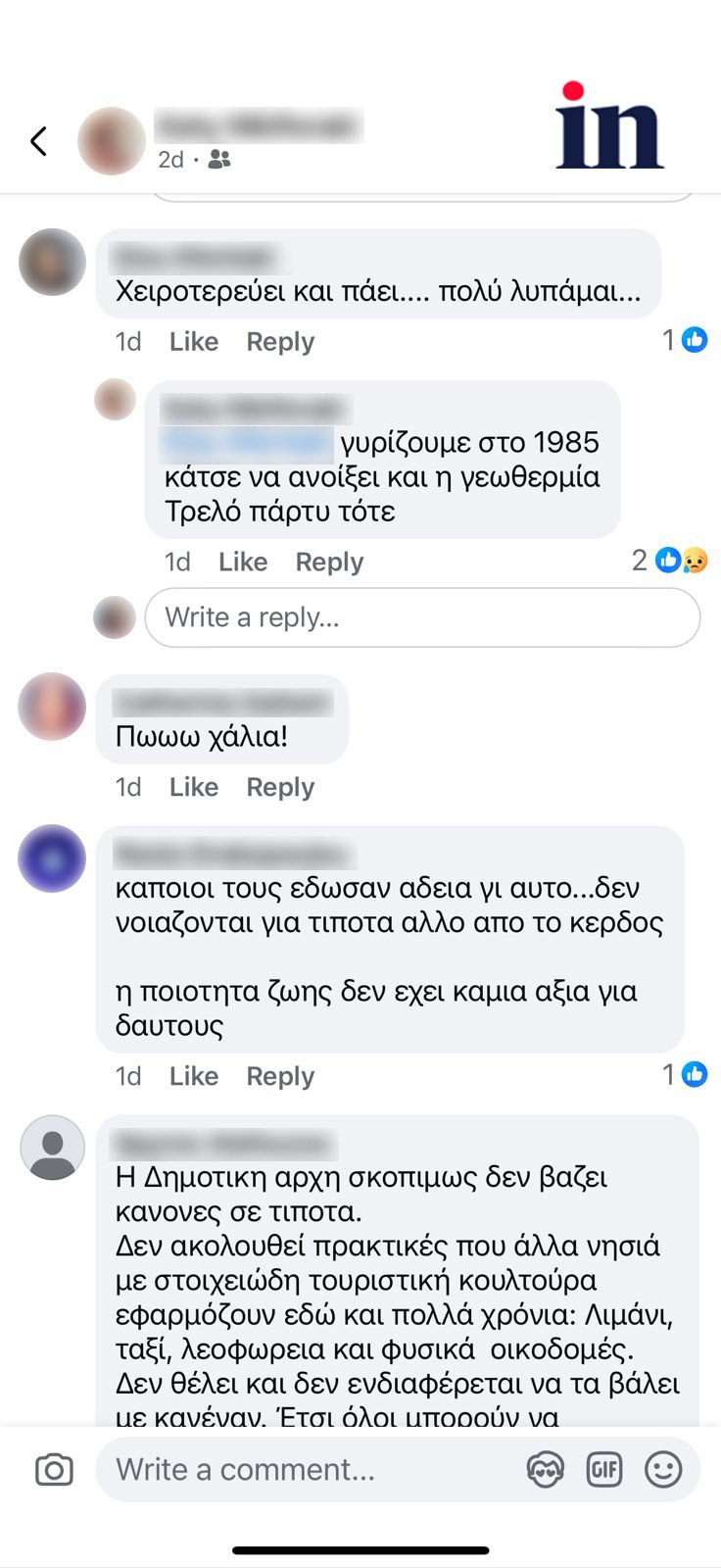 Σοβαρές είναι οι ανησυχίες και για τις επιπτώσεις στον τουρισμό, αφού σύμφωνα με τα όσα αναφέρουν οι κάτοικοι στις συνομιλίες τους, που είναι στη διάθεση του in, οι επισκέπτες ήδη καταγράφουν και αναπαράγουν τα όσα συμβαίνουν και «αργά ή γρήγορα θα αρχίσει ο κατήφορος».