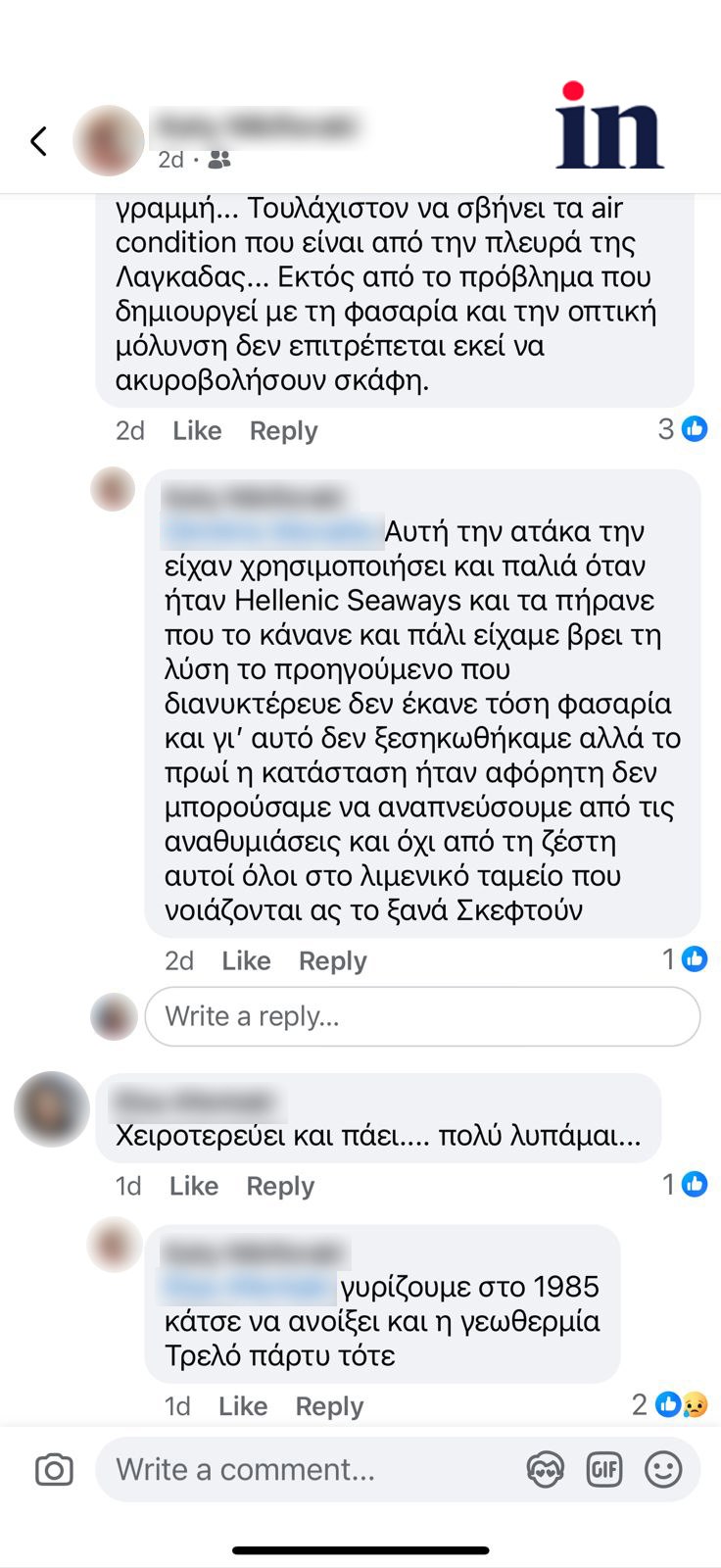 «Το πλοίο διανυκτερεύει στο συγκεκριμένο σημείο ύστερα από άδεια που του έχει δώσει το δημοτικό λιμενικό ταμείο», σημειώνει άλλος κάτοικος. Όπως αναφέρει δε στα μηνύματα που έχουν ανταλλάξει μεταξύ τους «στην απόφαση αυτή κάποιοι αντιδράσαμε γνωρίζοντας τι φασαίρα και τι πρόβλημα δημιουργεί». Ωστόσο στις αντιδράσεις όπως λέει «δεχτήκαμε επίθεση, λέγοντας μας ότι άμα είναι να του πούμε να πάρει το καράβι από τη γραμμή, δεν το θέλουμε. Είπαμε απλά να μην αγκυροβολεί εκεί και όχι να φύγει από τη γραμμή. Τουλάχιστον να σβήνει τα air condition που είναι από την πλευρά της Λαγκάδας. Εκτός από το πρόβλημα που δημιουργεί με τη φασαρία δεν επιτρέπεται εκεί να αγκυροβολήσουν σκάφη».