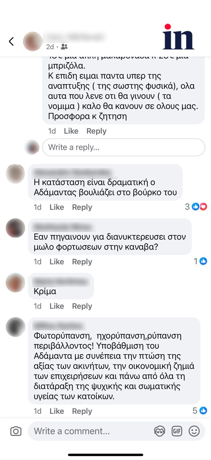 «Φωτορύπανση, ηχορύπανση, ρύπανση περιβάλλοντος! Υποβάθμιση του Αδάμαντα με συνέπεια την πτώση της αξίας των ακινήτων, την οικονομική ζημιά των επιχειρήσεων και πάνω από όλα τη διατάραξη της ψυχικής και σωματικής υγείας των κατοίκων», αναφέρει χαρακτηριστικά ένας από τους κατοίκους της περιοχής.