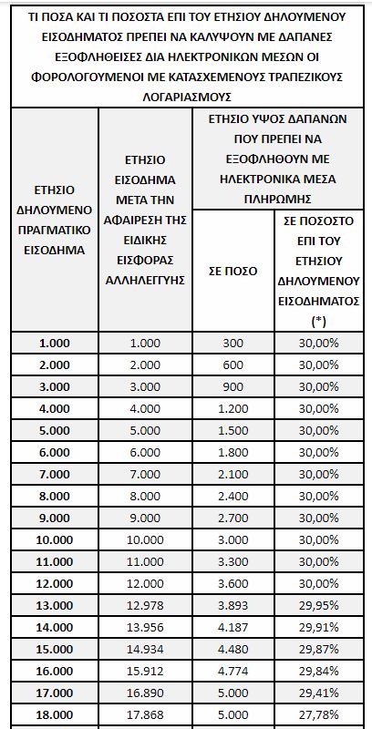Για τους φορολογούμενους αυτούς τα ποσοστά των ετησίων εισοδημάτων που πρέπει να καλυφθούν με ηλεκτρονικές πληρωμές δαπανών πέφτουν ακόμη και κάτω από 10%.